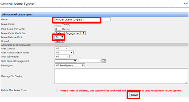 Step 1: Go to your General Leave Types Sub Folder under the leave configuration. Click on "Save" |