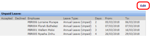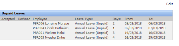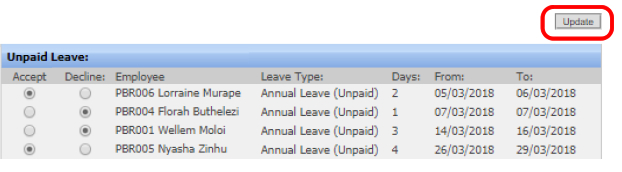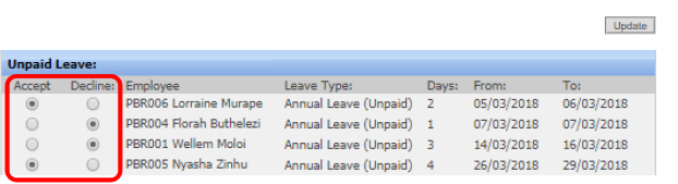 You should now be able to either Accept or Decline each unpaid leave transaction for the employees. |